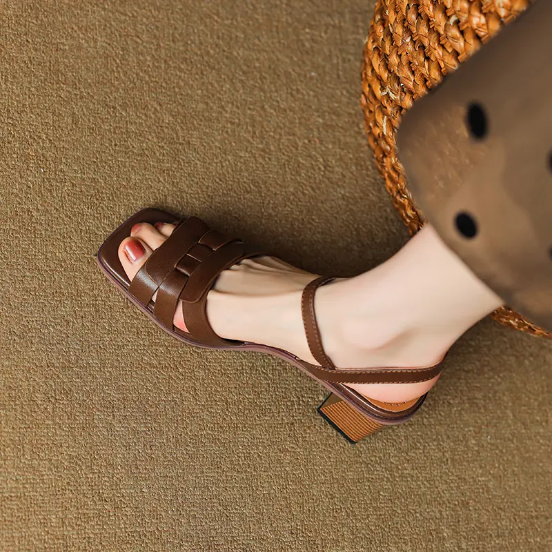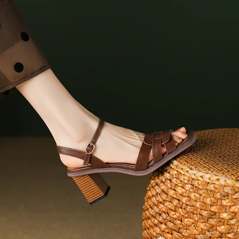 Genuine Leather Women Sandals Open Toe Chunky Heel Women Shoes Sheepskin